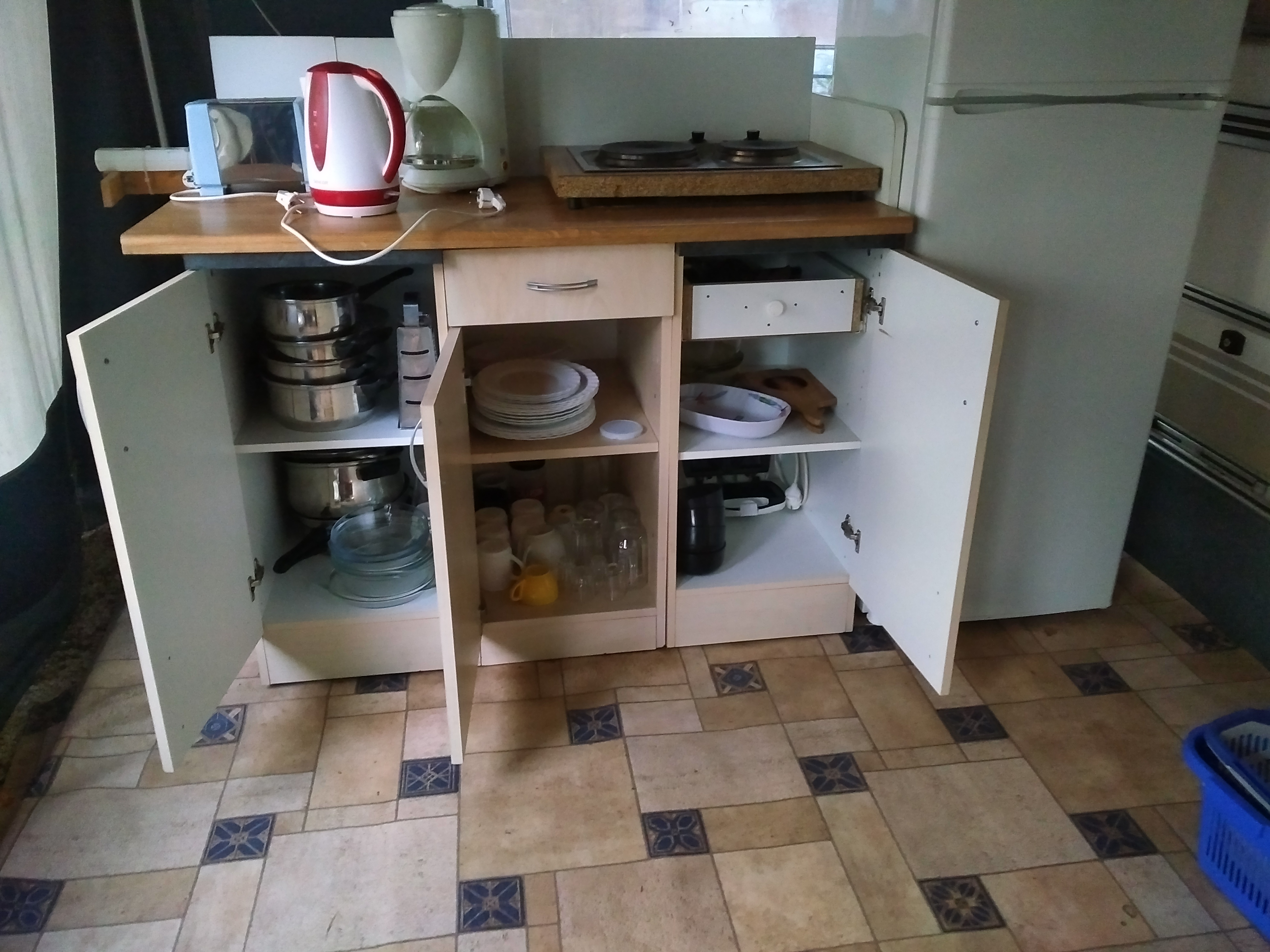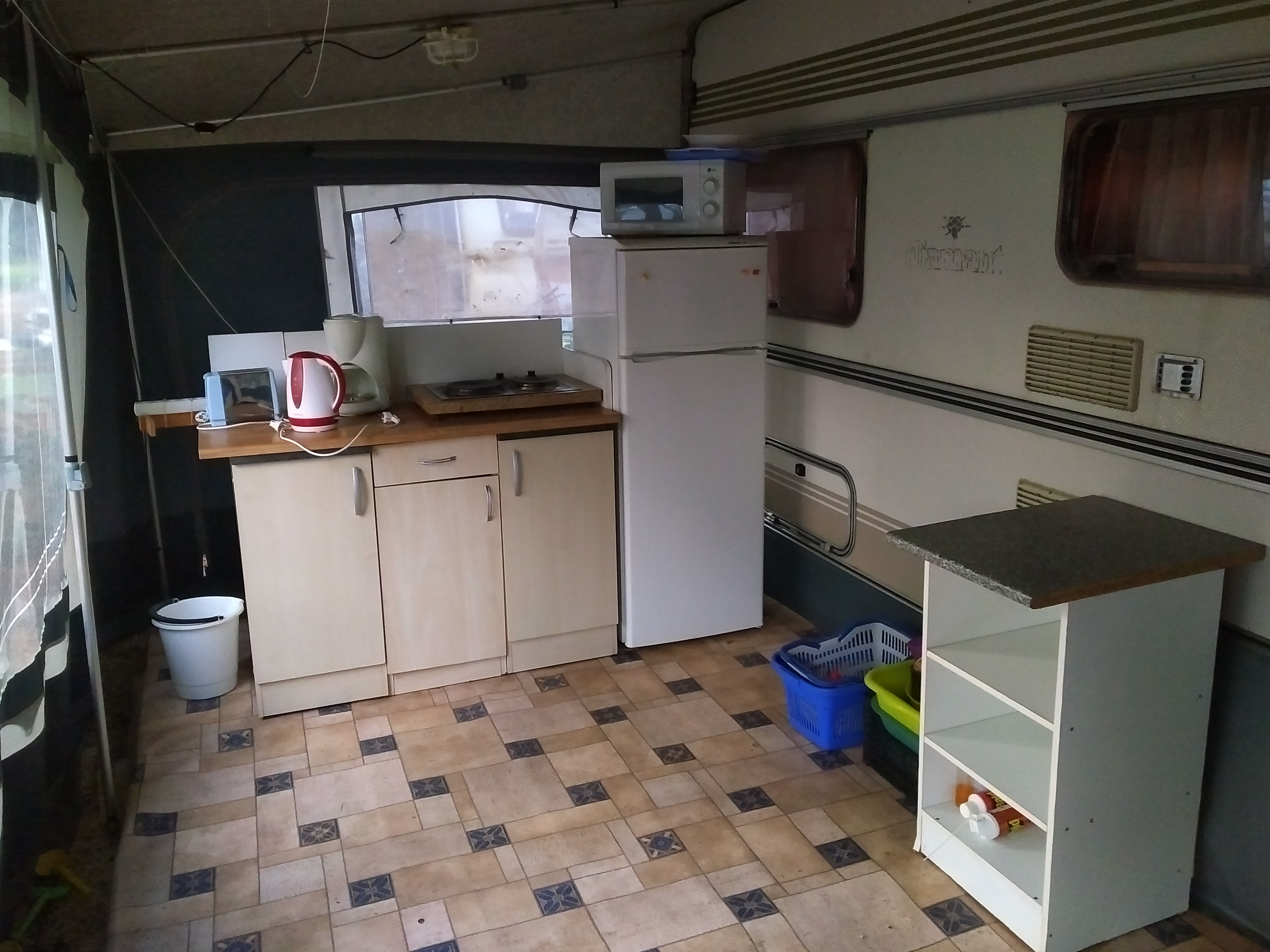 A nagyméretú elősátrakat dobogóval és burkolattal láttuk el a könnyebb tisztántarthatóság érdekében. Itt rendeztük be a főzésre alkalmas, komplett felszereltségű konyhát! Hűtőszekrénnyel, külön mélyhűtővel, mikrohullámú sütővel,kenyérpirítóval,vízforralóval és egyéb konyhai eszközökkel szereltük fel minden lakókocsinkat!(rozsdamentes edények, tányérok, poharak, evőeszközök, reszelő, dugóhúzó,vágódeszka, stb.) Az alapanyagokon kívül semmit nem kell magukkal vinni!